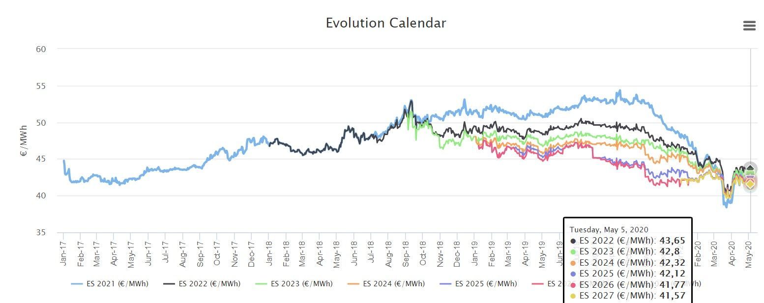 The same thing happens in electricity markets. Daily prices in the Spanish electricity market are struggling to stay above € 20 / MWh while futures markets (calendar products) seem to want to resist their falls below € 40 / MWh: